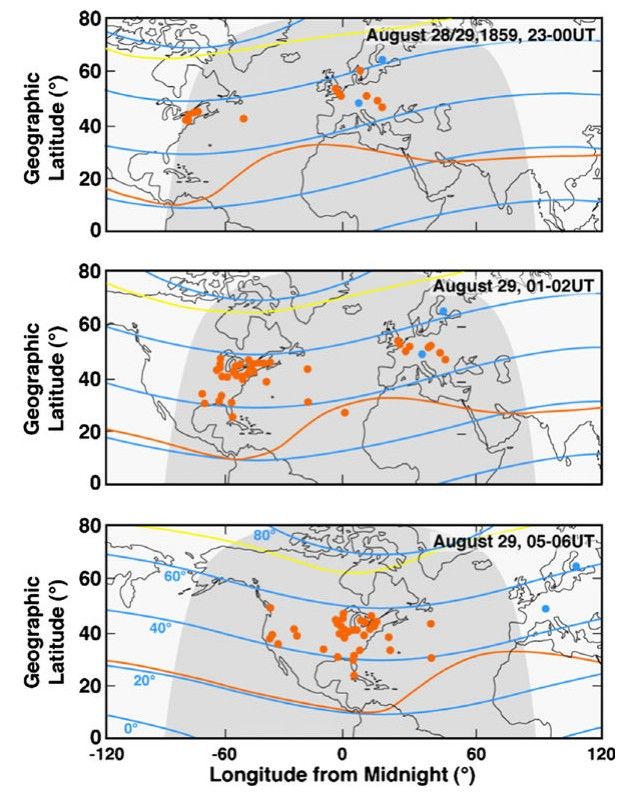 Eyewitness account locations (orange dots) and magnetometer stations (blue dots) of the great aurora on 28 August 1859 for selected time intervals from (Green & Boardsen, 2006).
